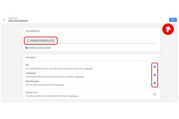 Now you've opened the permissions, you need to add our email address 'google@sonderdigital.co.uk' and select as many permissions as you're happy for us to have. The click the blue 'Add' button in the top right and we're done!